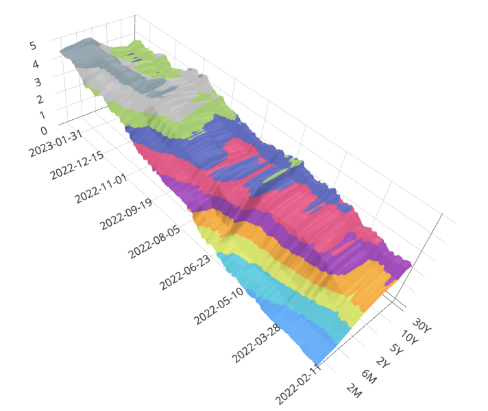 直近5週の金曜日のイールドカーブの比較を見ると、全体的に上昇していますが、引き続き短期債利回りが長期国債利回りを上回る「逆イールド」状態です。