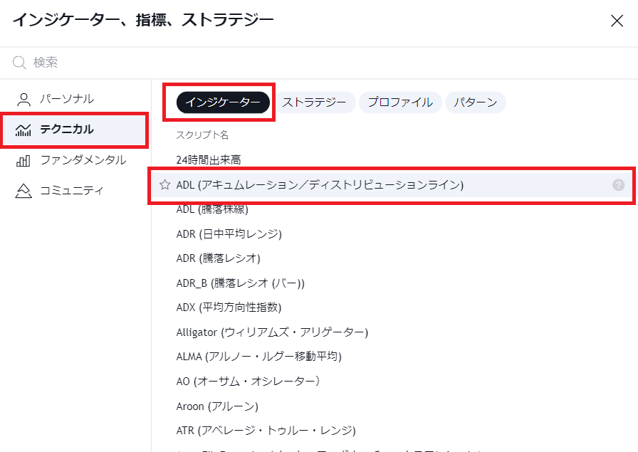 インジケーターウィンドウが開くので、「テクニカル」→「インジケーター」から「ADL(アキュムレーション/ディストリビューションライン)」をクリックします。