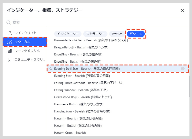 インジケーターウィンドウが開くので、「テクニカル」→「パターン」から「Evening Doji Star-Bearish(弱気の宵の同時線)」をクリックします。